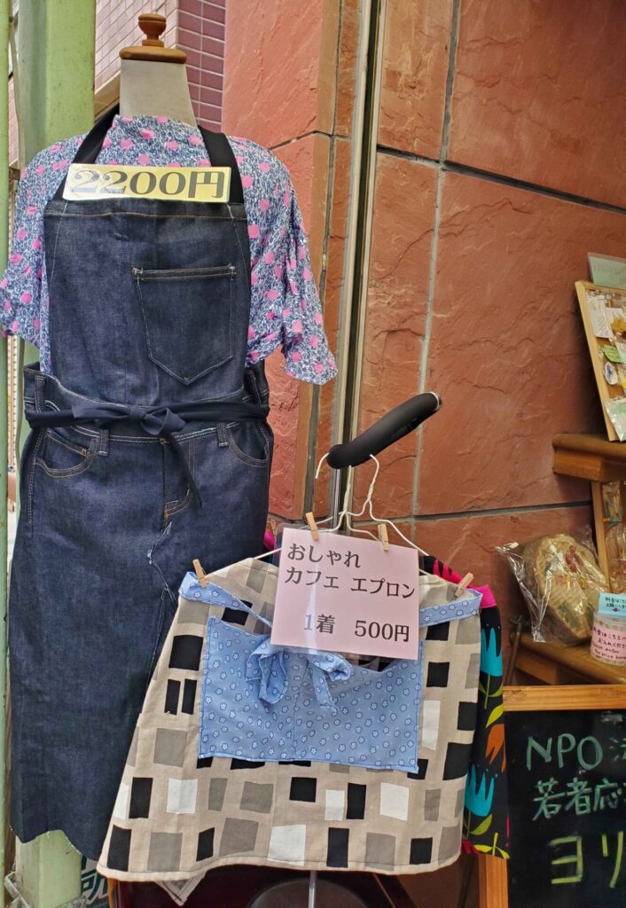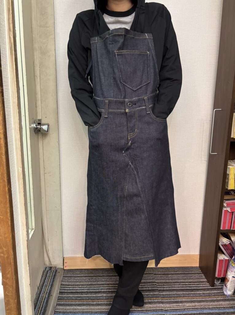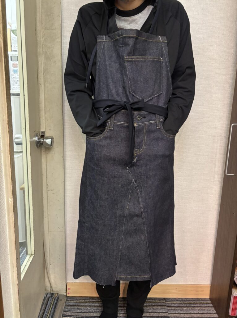 利用者さんがジーンズをリメイクしてこんなおしゃれで実用的なエプロンを作ってくれました。