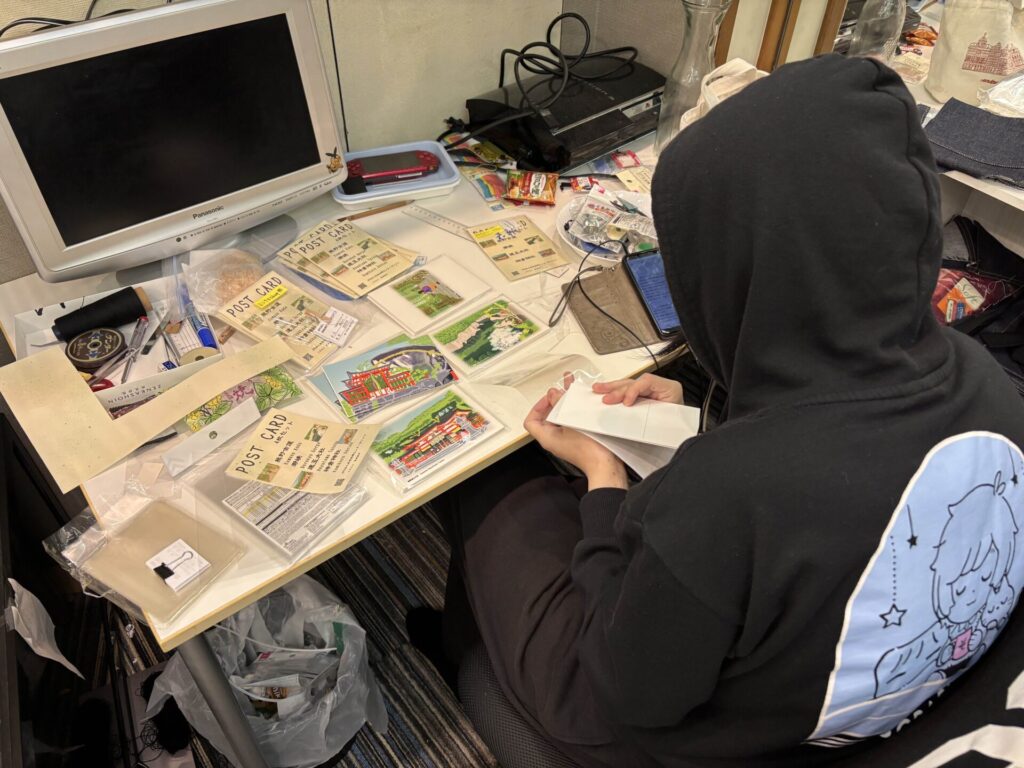 ヨリドコオリジナルのご当地ポストカードを袋に入れていきます