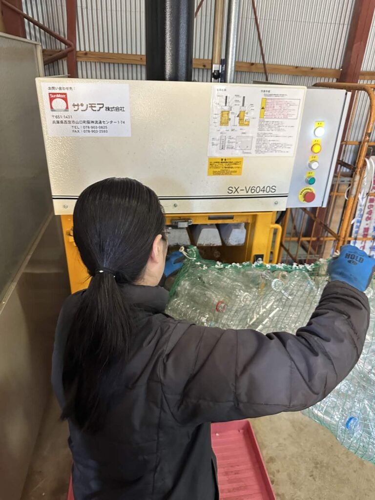 洗った分別したペットボトルを圧縮する機械に入れていきます
